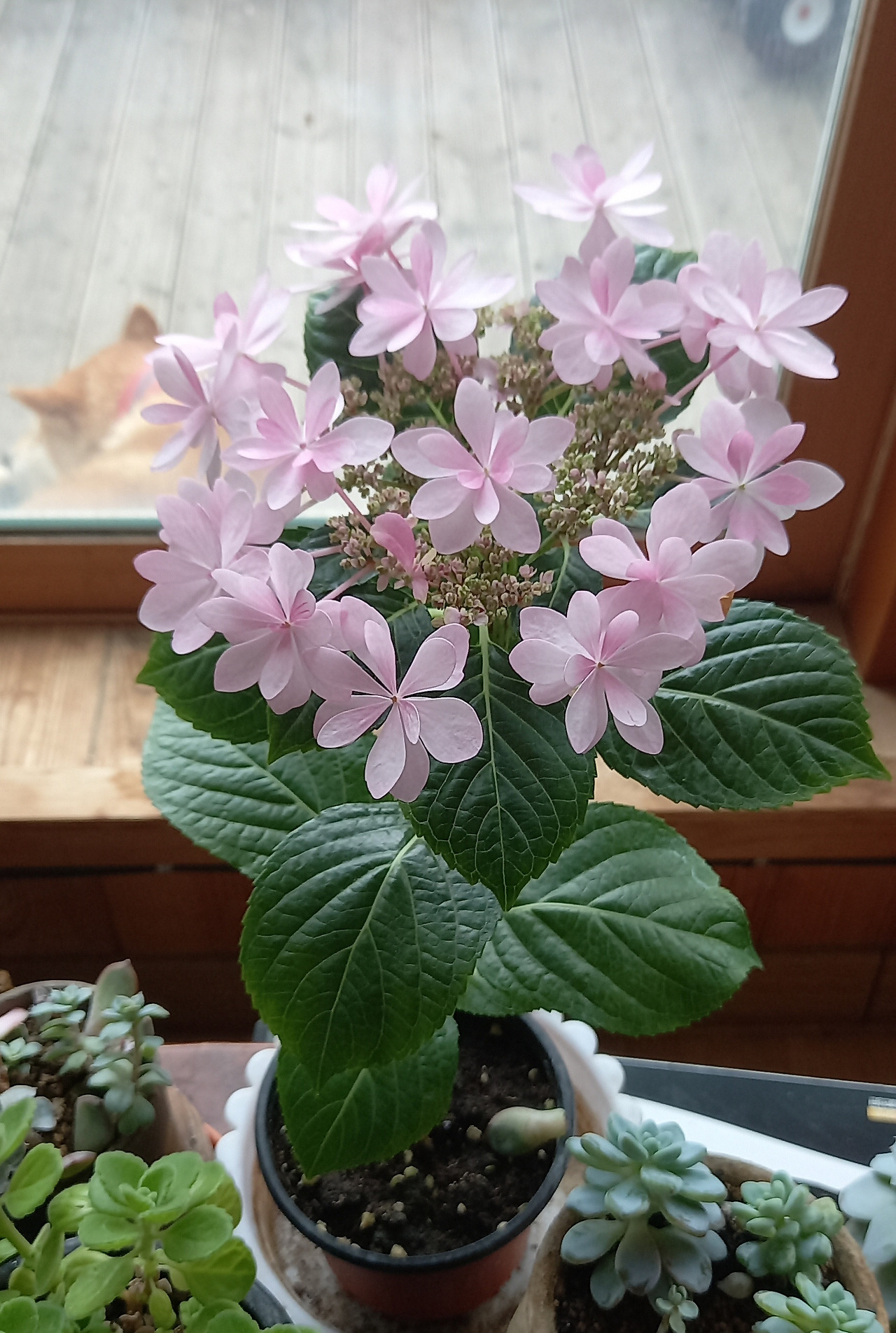 내가 고른 것은 서양 앵초와 수국, 카랑코에였다. 분홍 꽃들만 골랐는데 그중에 수국이 제일 예뻤다. 내가 아는 수국은 소담스럽게 피어나는 둥근 꽃다발 모양이었는데 이것은 내가 모르던 종류로 연연한 색깔도 예쁘고, 산수국처럼 성글게 피는 모양이 아주 예뻤다.