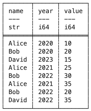 "name": ["Alice", "Bob", "David", "Alice", "Bob", "Alice", "Bob", "David"],