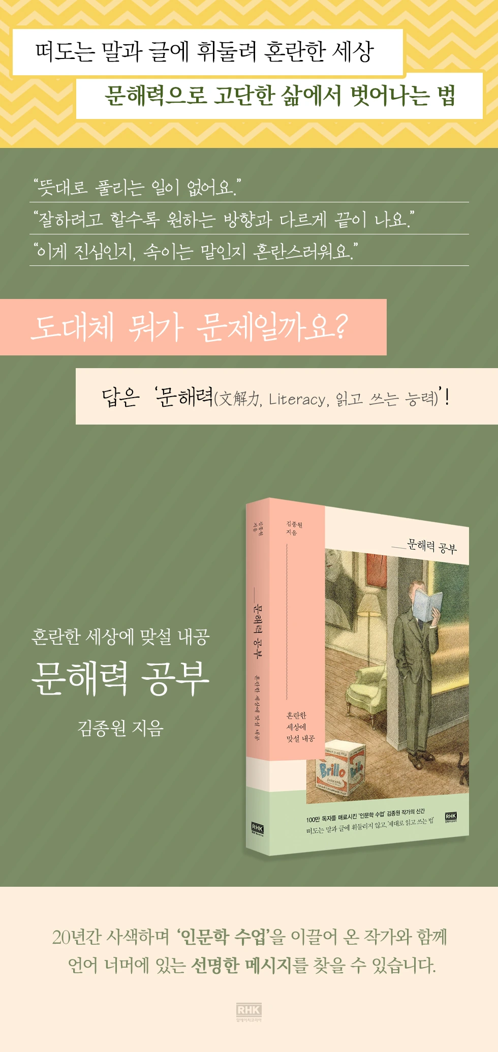 “아무리 잘하려고 해도 뜻대로 되지 않아 힘들다”라는 말, 누구에게나 한 번쯤 했었고, 들었던 말이다. 김종원 작가는 수백 회의 강연 현장에서 이러한 고민을 토로하는 독자들과 만났다. 그들의 고민은 천차만별이었지만, 결말은 같았다. 그리 노력했는데, 저 사람은 왜 여전히 고통을 받고 있을까. 그는 이들에게 단순하지만, 분명한 해결책을 꼭 하나 제시하고 싶었다. 그리하여 마침내 찾은 것이 문해력이다.