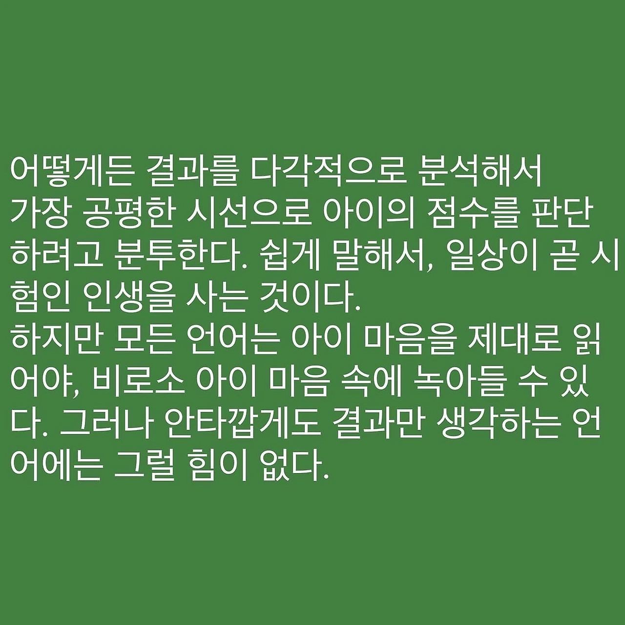 하지만 모든 언어는 아이 마음을 제대로 읽어야, 비로소 아이 마음 속에 녹아들 수 있다. 그러나 안타깝게도 결과만 생각하는 언어에는 그럴 힘이 없다.