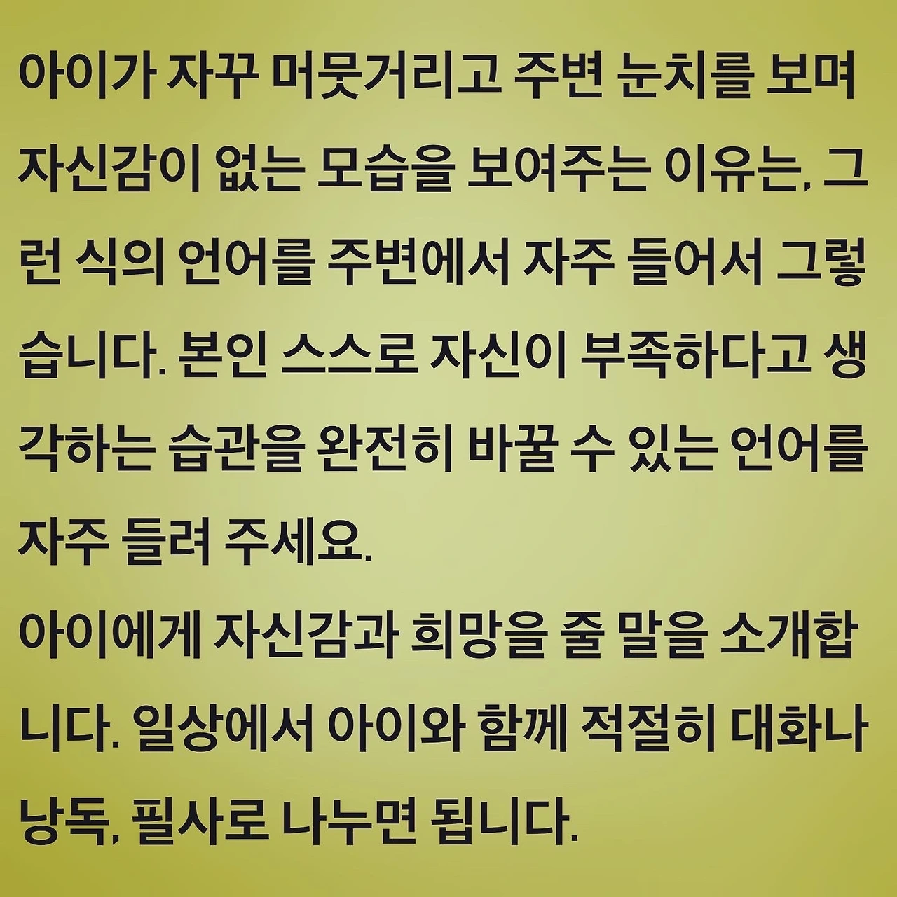아이가 자꾸 머뭇거리고 주변 눈치를 보며 자신감이 없는 모습을 보여주는 이유는, 그런 식의 언어를 주변에서 자주 들어서 그렇습니다. 본인 스스로 자신이 부족하다고 생각하는 습관을 완전히 바꿀 수 있는 언어를 자주 들려 주세요.