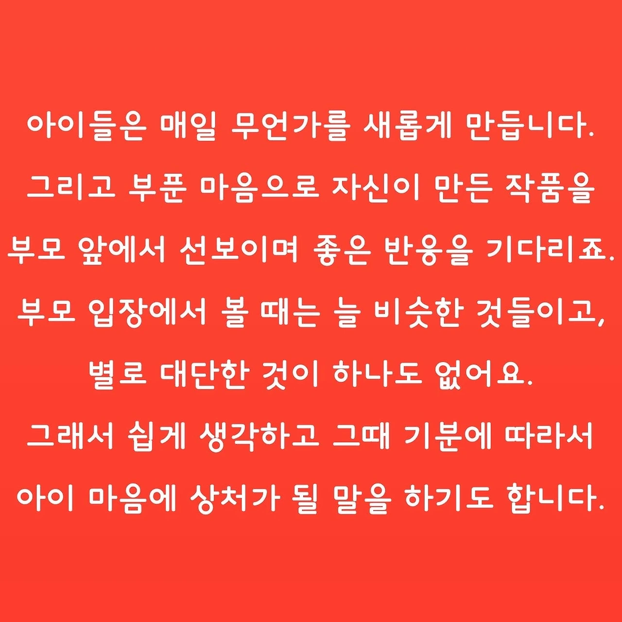오늘 아이가 만든 모든 것은 지금까지 부모가 보여준 언어의 합으로 이루어진 것입니다. 부모의 한마디가 아이들한테 어떤 영향을 끼치는지, 그 말이 아이가 만들 미래를 어떻게 바꿀 수 있는지 다시금 생각할 수 있다면, 언어를 골라서 쓰지 않을 수 없을 것입니다. 부모의 말은 ‘아이’라는 거대한 세계를 완성하는 견고한 벽돌입니다.