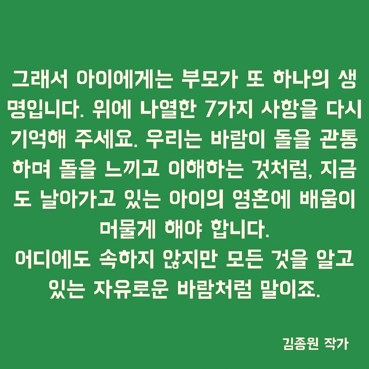그래서 아이에게는 부모가 또 하나의 생명입니다. 위에 나열한 7가지 사항을 다시 기억해 주세요. 우리는 바람이 돌을 관통하며 돌을 느끼고 이해하는 것처럼, 지금도 날아가고 있는 아이의 영혼에 배움이 머물게 해야 합니다. 어디에도 속하지 않지만 모든 것을 알고 있는 자유로운 바람처럼 말이죠.