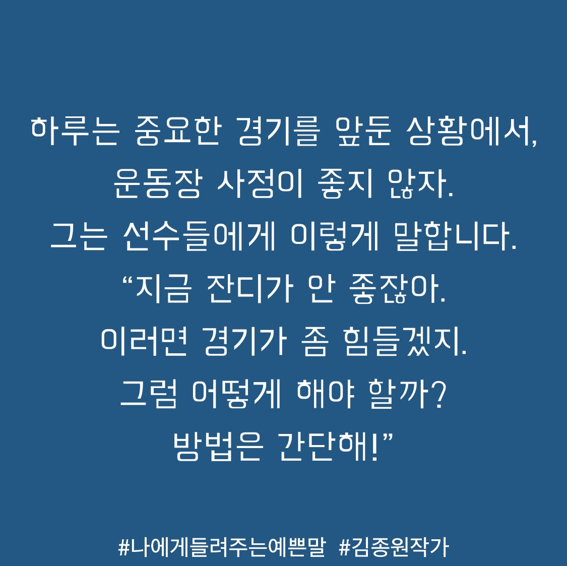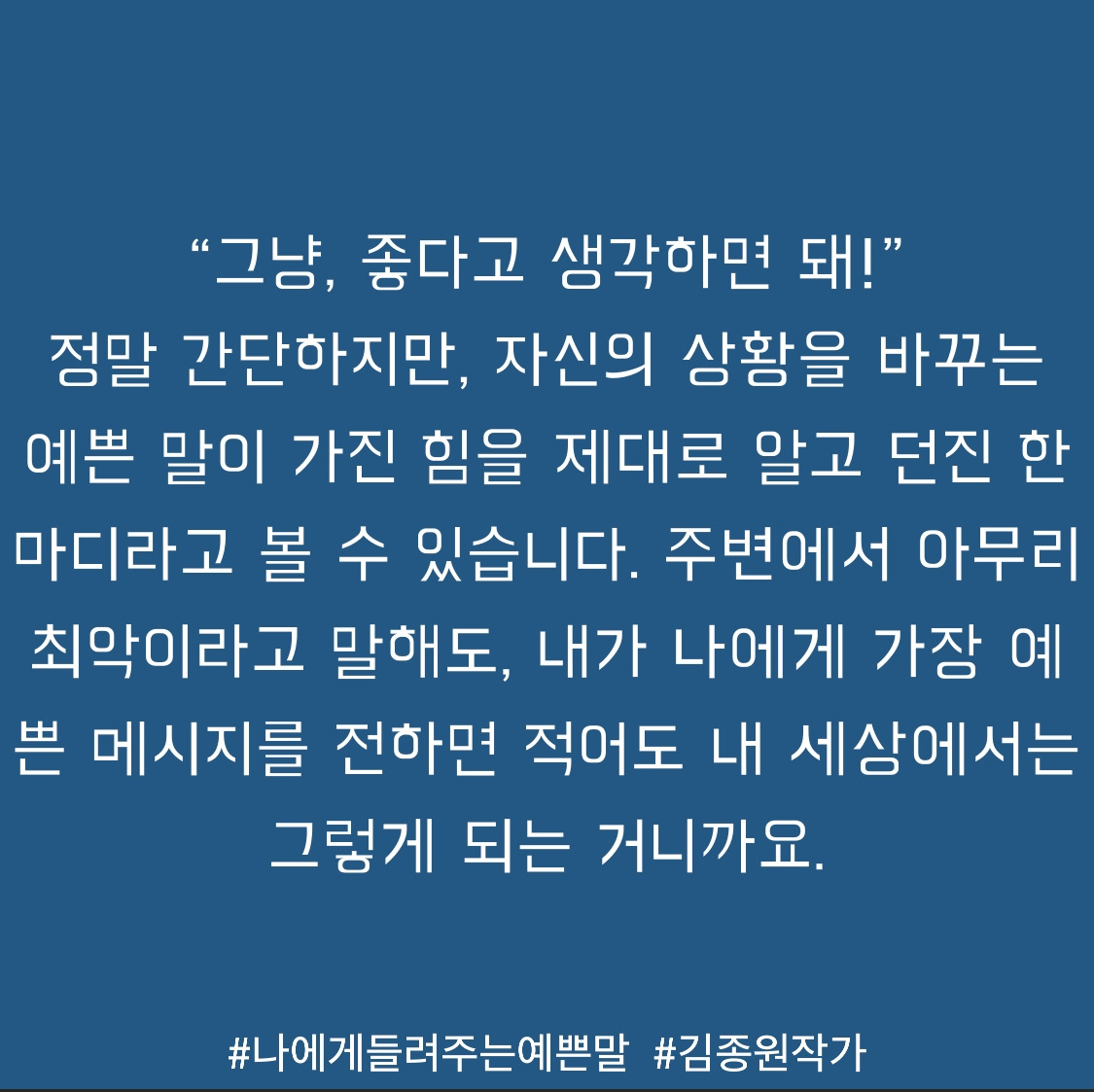 정말 간단하지만, 자신의 상황을 바꾸는 예쁜 말이 가진 힘을 제대로 알고 던진 한마디라고 볼 수 있습니다. 주변에서 아무리 최악이라고 말해도, 내가 나에게 가장 예쁜 메시지를 전하면 적어도 내 세상에서는 그렇게 되는 거니까요.