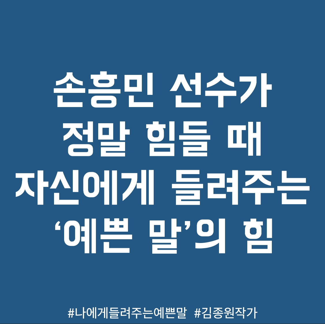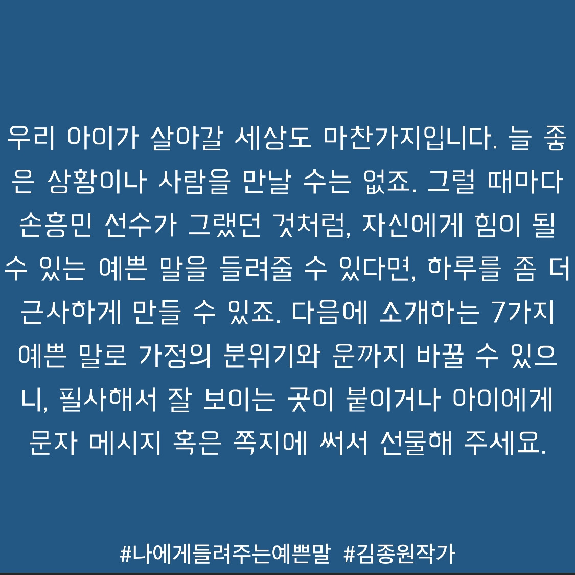 우리 아이가 살아갈 세상도 마찬가지입니다. 늘 좋은 상황이나 사람을 만날 수는 없죠. 그럴 때마다 손흥민 선수가 그랬던 것처럼, 자신에게 힘이 될 수 있는 예쁜 말을 들려줄 수 있다면, 하루를 좀 더 근사하게 만들 수 있죠. 다음에 소개하는 7가지 예쁜 말로 가정의 분위기와 운까지 바꿀 수 있으니, 필사해서 잘 보이는 곳이 붙이거나 아이에게 문자 메시지 혹은 쪽지에 써서 선물해 주세요.