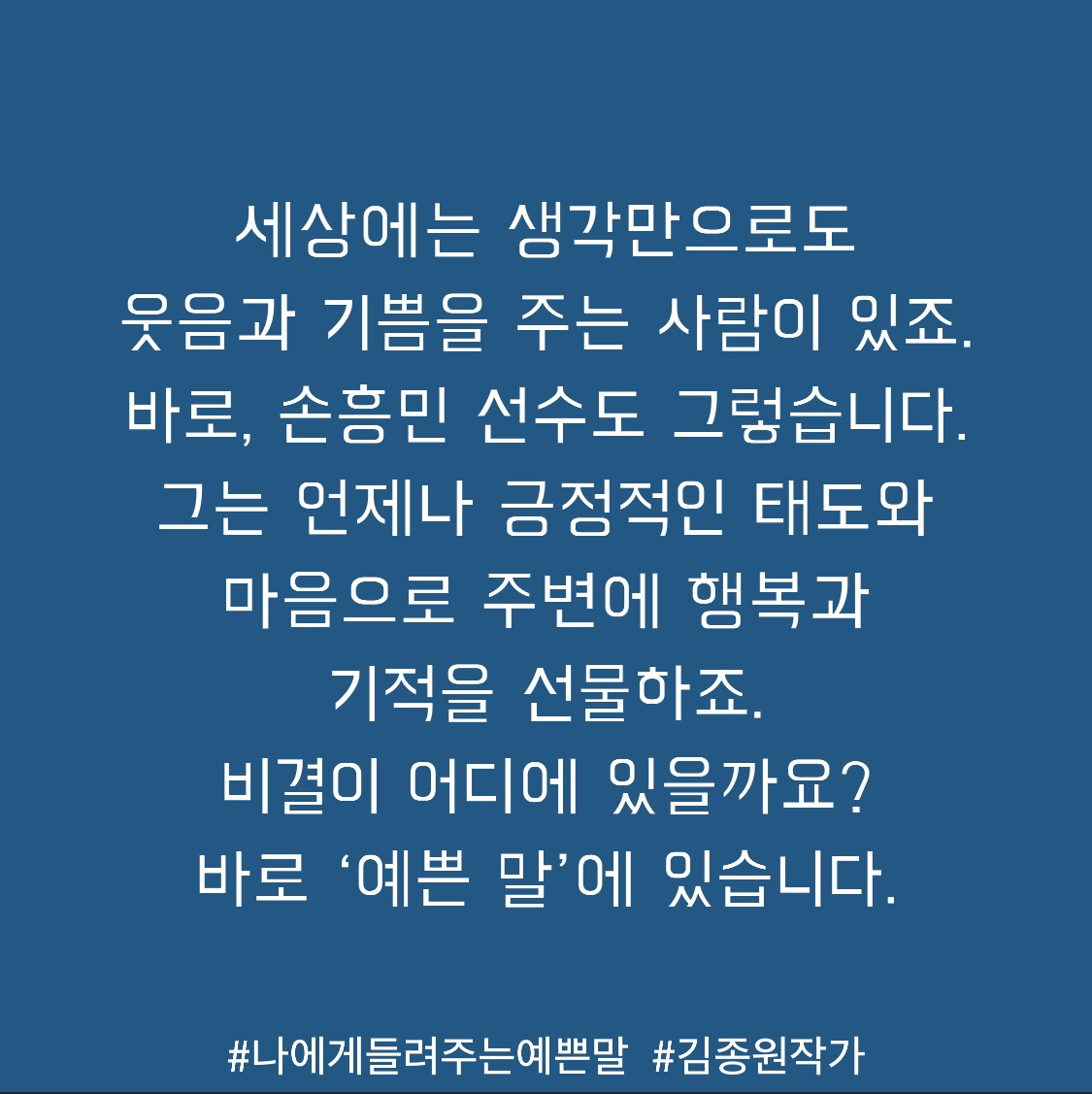 세상에는 생각만으로도 웃음과 기쁨을 주는 사람이 있죠. 바로, 손흥민 선수도 그렇습니다. 그는 언제나 긍정적인 태도와 마음으로 주변에 행복과 기적을 선물하죠. 비결이 어디에 있을까요? 바로 ‘예쁜 말’에 있습니다.