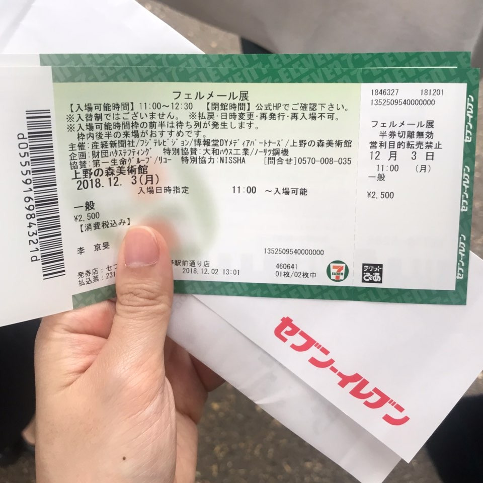 베르메르 전시요금은 생각보다 비싸다. 성인 2500엔, 대학생 1800엔이다. 비싼 가격에 비해 전시가 조금 짧게 느껴지는 건 사실이다. 베르메르 8점이 다 한 거 지만 양으로 따진다면 보고 나왔을때 실망할수도 있겠다. 이 전시는 100프로 예약제로 운영된다. 그래서 정해진 인원이 정해진 시간에 전시를 본다. 또한 무료 음성해설서비스를 제공한다. 영어로 된 수신기도 있으니 걱정마라. 그런데 인터넷 예매가 일본 내에서만 가능하다. 한국에서는 접속도 되지 않아 예매 할 수 가 없다. 하지만 아직 실망하기는 이르다. 일본 도쿄 세븐일레븐에서 해당 전시의 티켓을 구매할 수 있는 머신이 따로 있다. 세븐일레븐 머신 사용법 https://blog.naver.com/caseylee/221386840398