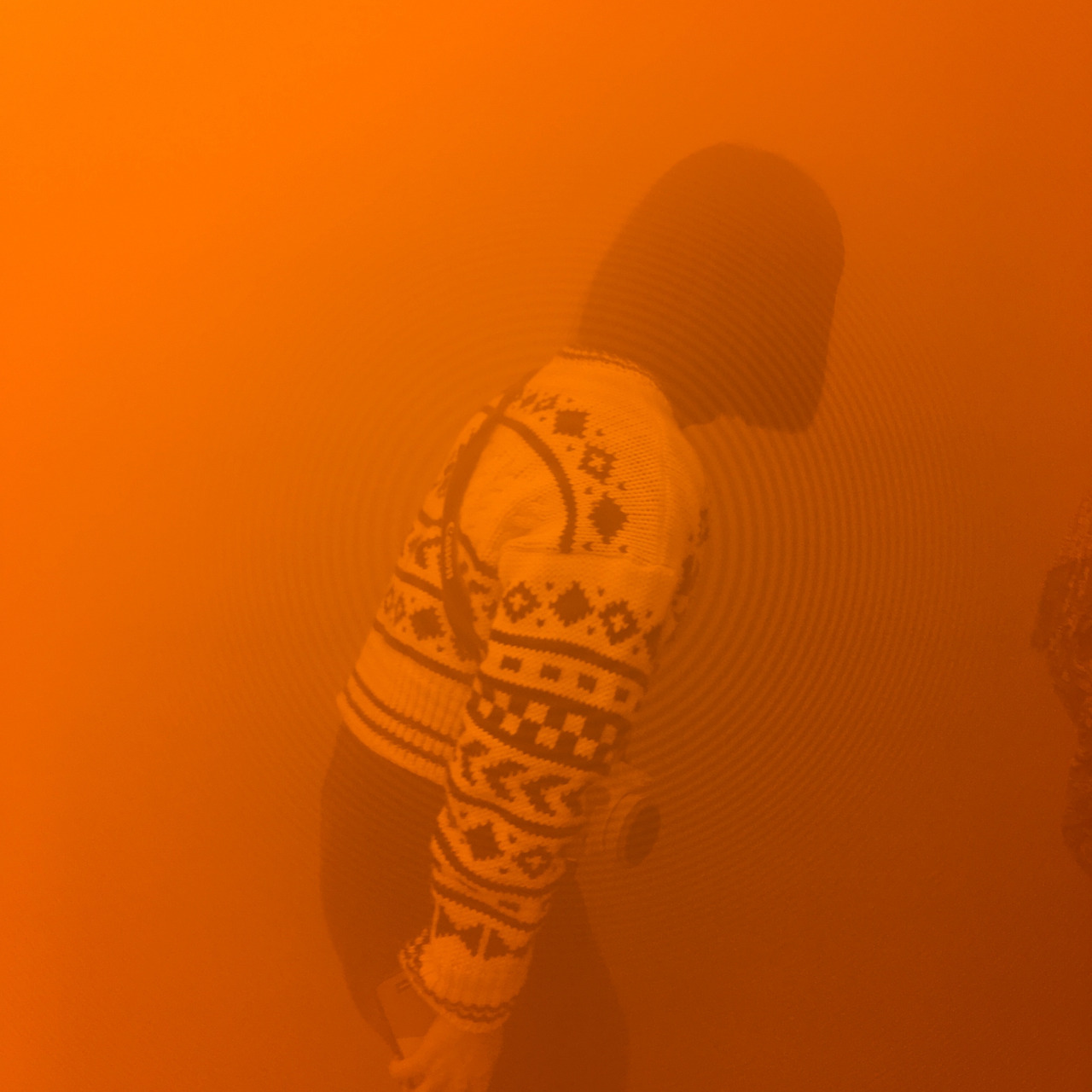 인원수를 제한시켜 입장시켰는데. 내 차례가 되어 작품 속에 들어간 순간 일시적으로 앞이 보이지 않았다. 왜 줄을 세워 들여 보냈는지 바로 이해가 되었다. 주황빛, 푸른빛의 안개가 자욱하게 가라앉아 시야를 가리고 있었다. 작품에 사용되는 뿌연 물질은 인체에 무해하다고 했지만 마치 미세먼지를 들이마시는 기분이었다. 다른 관람객들의 모습은 물론 내 자신도 제대로 보이지 않은채 팔을 휘저으며 그 공간을 빠져나왔다.