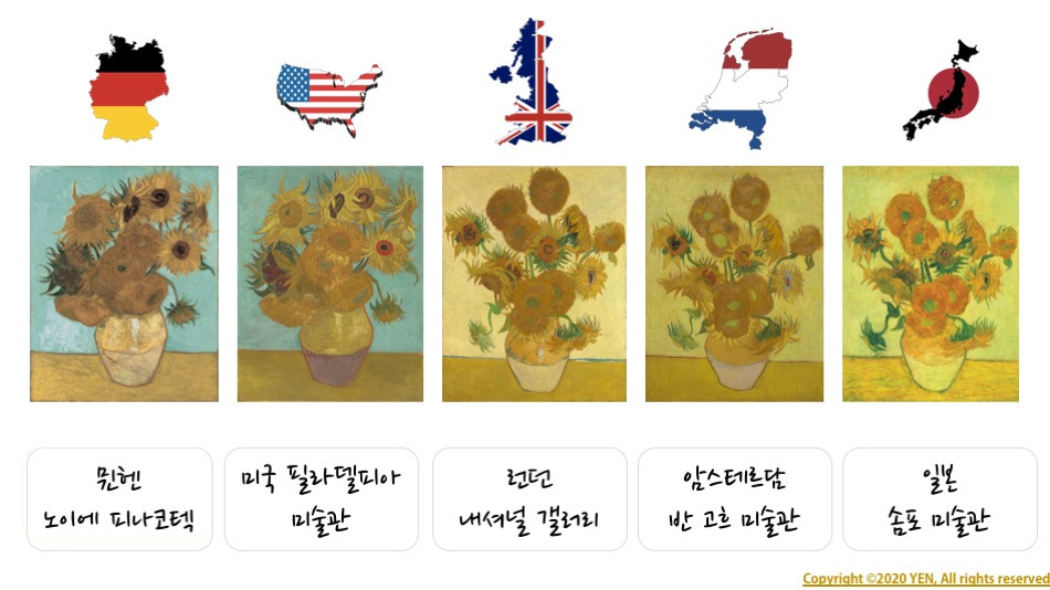고흐가 아를시기에 그렸던 7가지 버전의 해바라기를 모두 볼 수 없다. 1점은 미국의 개인소장자가 가지고 있고 또 1점은 2차 세계대전때 오사카 연합군 폭파로 일본에서 화재로 소실되어 만나볼 수 없다. 나머지 5점의 해바라기는 다섯 곳에 나누어져 있다.