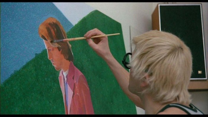 그림 속 두 남자는 누구일까. 그림의 원제목은 Portrait of an artist (pool with two figures)이다. 제목이 두개이다. 수영하는 자신의 모습을 호크니 자신이 쳐다보고 있다는 주장과 수영하는 자신을 쳐다보는 그의 애인 피터의 모습, 2가지 설이 존재한다. 호크니의 애인 피터 슐레진저는 그의 그림에 자주 등장하는데, 호크니보다 11살 어렸다고 한다.