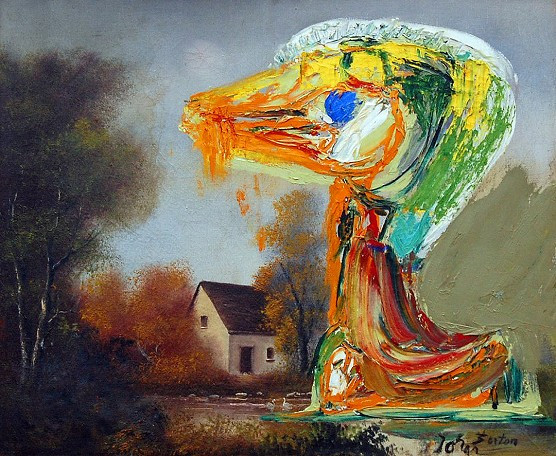 이 작품은 이미 존재하는 작품 위에 그린 그림이다. 무명작가의 키치적 풍경화 위에 천연덕스럽게 자신의 그림을 덧바른 것이다. 뒤샹이 '미'의 기준을 뒤바꾼것처럼 그도 미술계의 아카데미적 흐름을 그대로 받아들이지 않았다. 사고의 전환, 방향의 전환으로 만들어낸 작품이다.
