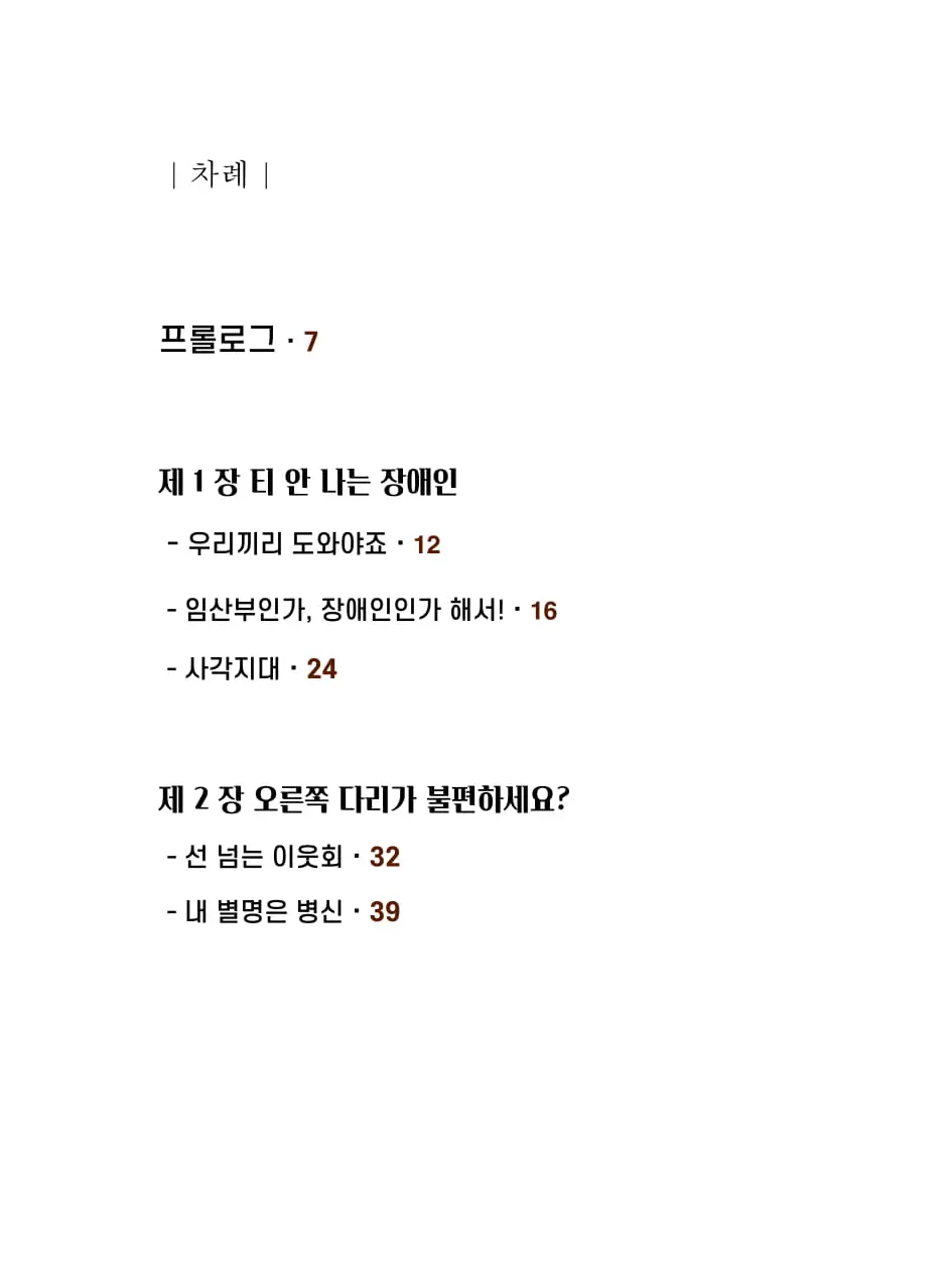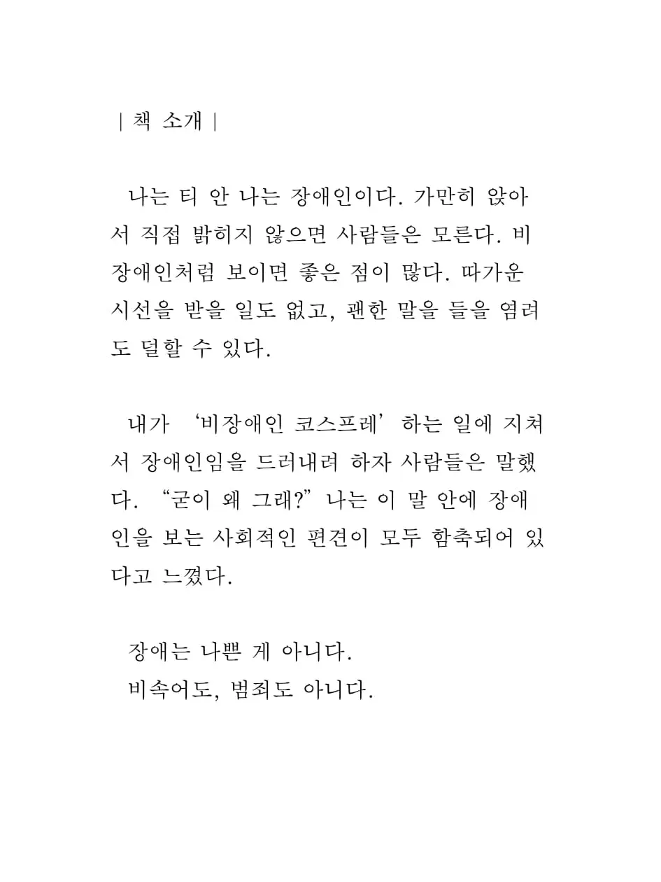 우리 주변의 장애인의 이야기는 너무나 드물다. 분명히 장애인은 존재하는데, 장애인의 이야기가 드물다. 찾아봐도 너무 오래되었거나 '비장애인을 위한' 장애인의 이야기인 경우가 많다. 예를 들어 장애가 있는 사람도 이렇게 열심히 사는데, 비장애인인 당신이라면 더 잘할 수 있어요! 같은 이야기 말이다. 어렵사리 찾은 장애인의 이야기는 너덜너덜해질 때까지 읽었으나, 세상에는 다양한 장애가 있고 나와 비슷한 장애인의 이야기를 찾기는 매우 어려워서. 그 이야기가 와닿지 않을 때도 많았다.
