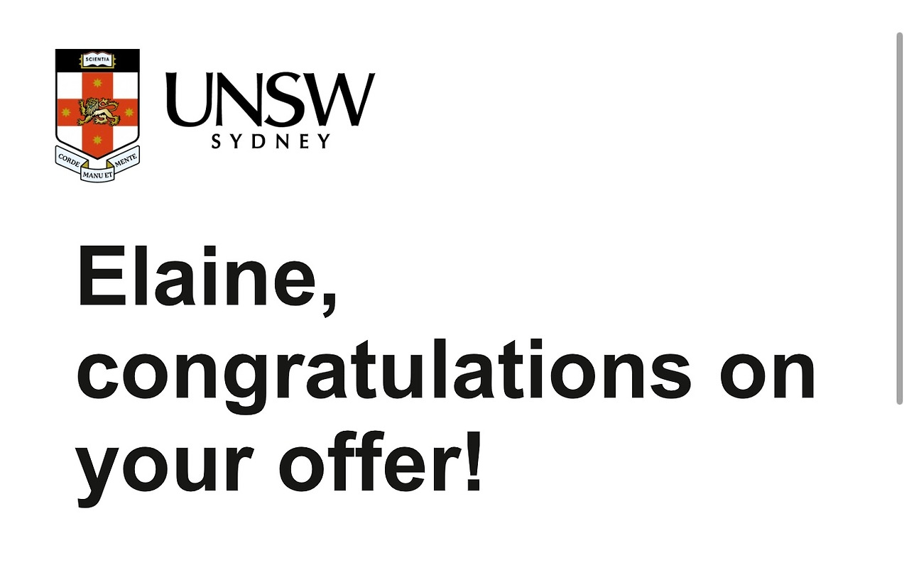 UNSW랑 맥콰리 둘 다 합격했는데, 난 내가 현재 일하고 있는 UNSW로 결정했어. 왜냐면 지금은 내가 UNSW 교직원이라서, 학생 때랑은 달리 주차장도 이용할 수 있고 몇 가지 혜택들도 받을 수 있거든. 이게 진짜 차 있는 사람들한텐 아주 중요한 문제야. 우리 집이 학교랑 좀 멀어서 더더욱 그렇고!