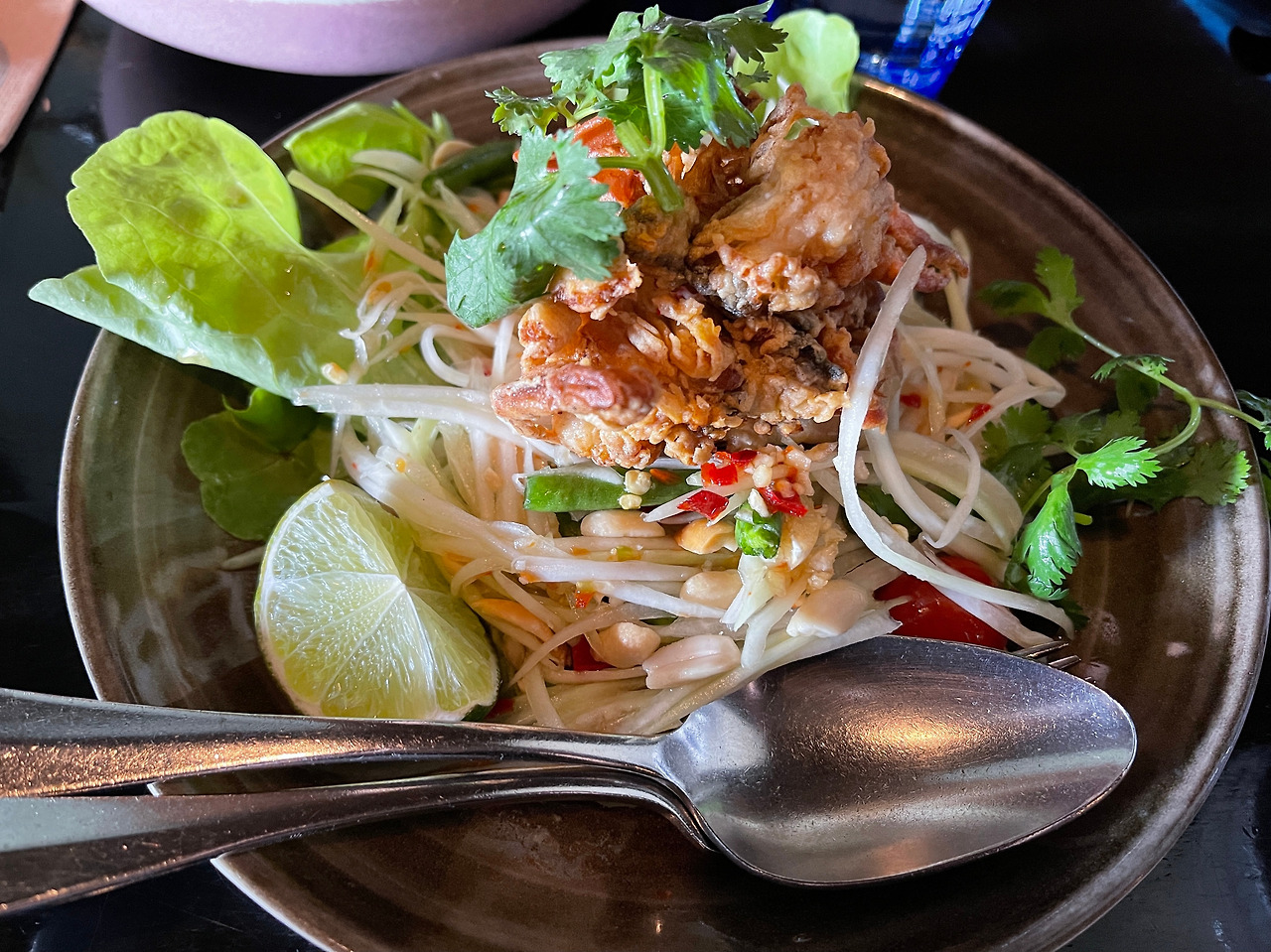 필자가 좋아하는 타이 요릿집에 가서 쏨땀 샐러드(그린 파파야 샐러드)에 게 튀김을 곁들어서 상큼하게 먹었고, 새우 얹은 볶음 국수 요리인 팟타이, 튀긴 두부를 넣은 야채 그린 카레를 먹었다.