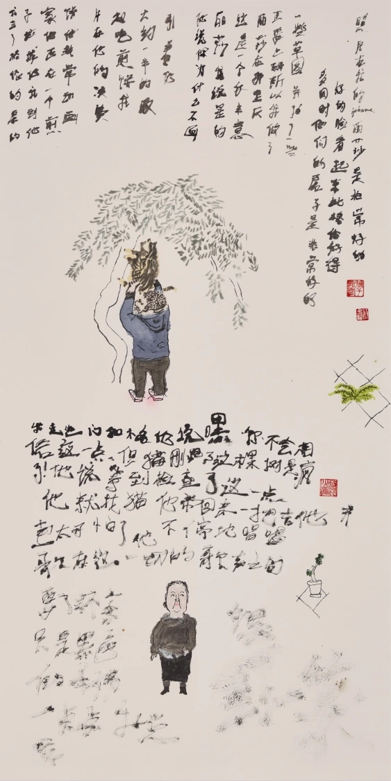 제이슨 푸 Jason Phu라는 UNSW 출신의 미술가가 아치볼드 공모전을 위해 그린 리사와 글렌이다. (내가 내년에 아치볼드를 위해 글렌 그리려고 했는데... 늦었다. 몇 년이나 늦었어..) 이 그림의 제목은 '리사는 글렌보다 훨씬 더 즐거운 얼굴을 하고 있습니다. 그녀는 기타를 치는 동안 끔찍하게 노래를 부르지 않았거나 내가 그녀를 그리는 동안 고양이를 나무에 올리려고 하지 않았습니다.' (Lisa has a much more pleasant face than Glenn. She doesn’t sing horribly while playing guitar or try to put her cat up a tree while I’m painting her). 작가 제이슨 푸의 정체성을 나타내 주는 낙서 같은 배경의 서예도 인상적이고, 글렌과 리사와 함께 서로 잘 어우러진다.