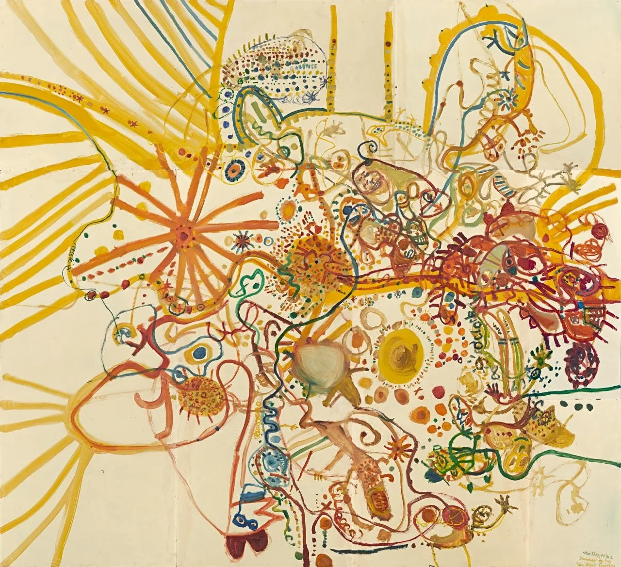태양의 이미지는 그가 그림에서 가장 많이 사용하는 주제 중의 하나이다. 그림 속의 노란색 선들은 햇빛의 광선을 나타내며, 다른 선들과 교차하고 합쳐져서 마치 거미줄 같은 모양을 만든다. 마치 그림은 지도처럼 펼쳐지는 것을 볼 수 있다. 존 올슨은 광대한 지형에 은유적으로 풍경을 표현했으며, 이 그림은 여러 관점에서 본 무한한 시각들이 합쳐진 것이라고 생각한다. 즉흥적인 그림이지만 이것은 그가 기억하고 느꼈던 그 모든 에너지들이 선과 색을 통해서 그림으로 나타난 것이다.