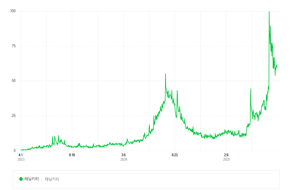 3. 네이버 데이터랩에서 ‘태닝키티’ 키워드 검색량을 보면, 매년 여름 증가하는 추세를 보여왔지만, 올해에 들어 그 수치가 폭증한 것을 알 수 있다.