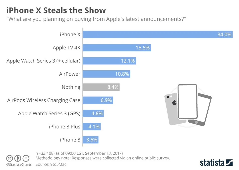 실제로 9TO5 MAC에서 행사 직후 "애플 행사 후에 뭐가 사고 싶어 졌느냐?"라고 설문 조사를 했는데, 약 35%가 아이폰 X을 꼽았다. 그다음은? 애플 TV, 애플 워치가 뒤를 이었다. 아이폰 8과 플러스는 합쳐서 7.5% 밖에 얻지 못했고.