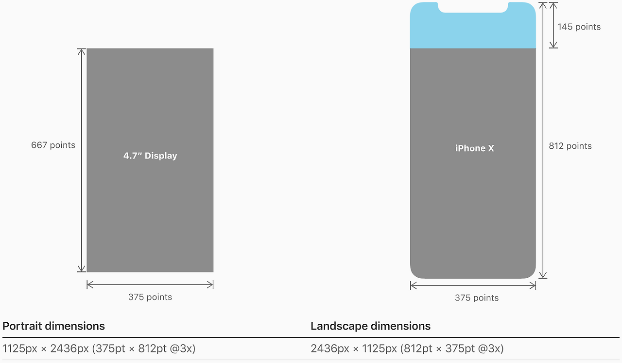 세로인 경우 iPhone X의 디스플레이 너비는 iPhone 6, 7, 8의 4.7 인치 디스플레이의 너비와 일치합니다. 그러나 iPhone X의 높이는 4.7인치 디스플레이보다 145pt가 더 큽니다. 이는 콘텐츠를 볼 수 있는 영역이 20% 늘어났다는 것을 의미합니다.