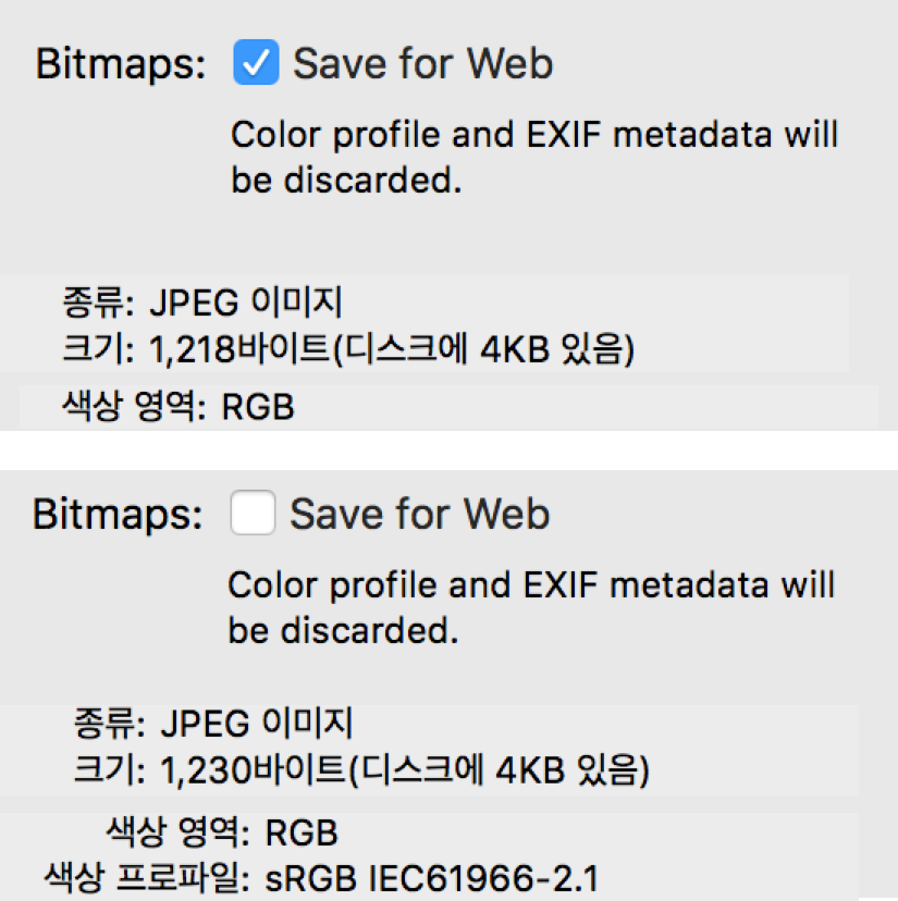 즉, Save for Web을 체크한 이미지는 웹에서만 쓰일 것이기 때문에 color profile과 EXIF metadata는 필요 없게 됩니다.