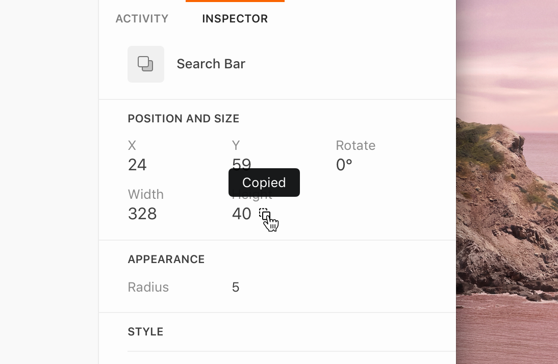 Activity 옆에 있는 Inspector를 클릭하면 정보를 볼 수 있습니다. 선택한 레이어 혹은 아트보드에 해당하는 정보를 보여주게 됩니다.
