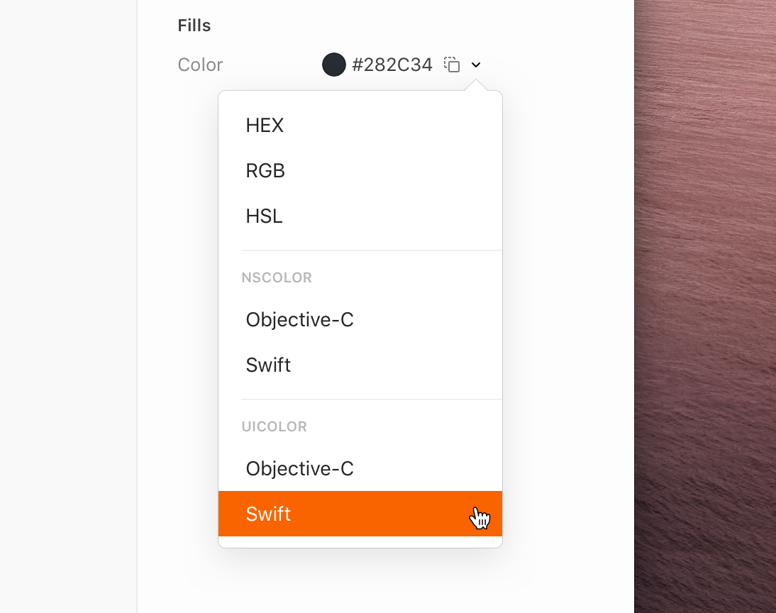 컬러 값의 경우 Objective-C 및 Swift의 NSColor 및 UIColor 형식뿐만 아니라 HEX, RGB 및 HSL 등으로 원하는 컬러 값을 가져올 수 있습니다.