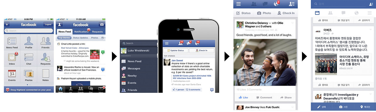 페이스북의 서비스 초기화면(맨 왼쪽)은 첫 화면에 아이콘과 메뉴를 타일 형식으로 나열한 것을 볼 수 있습니다. 시간이 지나면서 사용자가 뉴스피드를 가장 많이 사용한다는 데이터를 얻게 되고 메인에 뉴스피드를 보여주게 됩니다. 가운데 이미지를 보시면 햄버거 버튼이 추가된 것을 볼 수 있습니다. 마지막으로 햄버거 버튼이 불편하다는 데이터를 토대로 탭 기능과 검색 기능을 강조한 인터페이스로 바뀌게 됩니다.