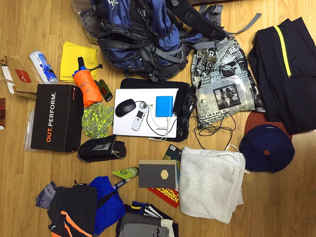 챙긴 물품 : 트래킹화, 언더레이어(운동할 때 입는 쫄쫄이) 상하의 두 벌, 스포츠웨어(운동복) 상하의 두 벌, 평상복(반팔, 반바지) 상하의 한 벌, 속옷 두 벌, 등산용 양말 5켤레, 바람막이, 모자, 마스크, 세면도구, 스포츠 타월 2개, 손전등, 지도, 노트, 배낭 (+ 노트북, 녹음기, 충전기, 에그)