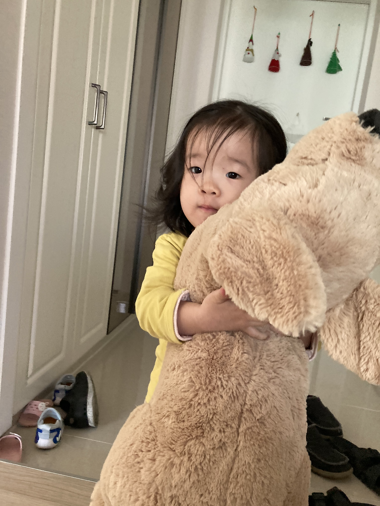 - 엄마가 같이 사 온, 주방놀이만큼이나 도은이를 사로잡은 강아지 인형 : 부모님이 사는 시골에 ‘바디’라는 이름의 개를 키우는데, 도은이가 놀러 가서 무척이나 인상이 깊었는지 보이는 모든 개들을 바디라고 부른다. 그 얘기를 했더니 엄마가 도은이만 한 강아지 인형을 같이 사 왔는데, 보자마자 “바디! 바디!” 하며 좋아했더랬다.