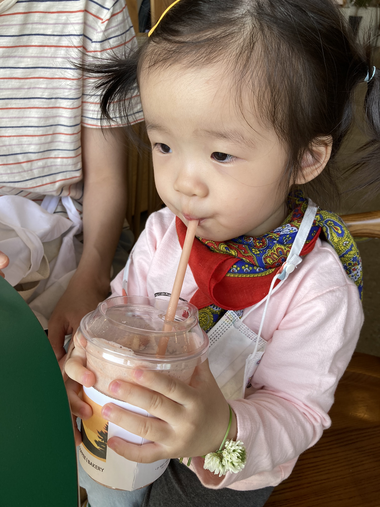 - 생애 첫 사제 음료 섭취 : 할머니, 할아버지와 함께여서 가능한 일들 중 하나는 도은이가 그동안 먹어보지 못했던 것들을 먹어볼 기회가 생긴다는 점. 대청호 카페에서 어머니는 도은이도 이런 걸 먹어볼 때가 됐다며 토마토 주스를 시키셨고, 도은이는 생애 첫 카페 음료를 마시게 된 것이다. 몇 번 쭉쭉 들이키던 도은이는 주스가 얼마나 맛있는지 자랑이라도 하려는 듯 한 명씩 맛보라며 빨대를 내밀었다. 그러면서도 혹시나 빼앗길까 두 손으로 컵을 꼭 잡고 있었다. 정말, 내 딸이지만 귀여운 생명체다.