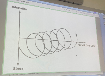 이거슨, 새로운 장소에서 우리가 느끼는 스트레스와 적응도의 상관관계에 관한 그래프다.