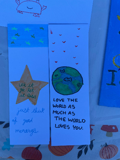 자신이 만든 카드와 북마크를 끌어안고.