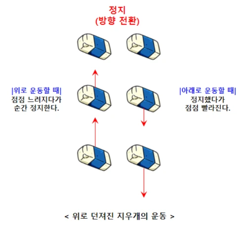 이제, 간단한 상황 하나를 생각해 봅시다. 손에 들고 있는 지우개를 위로 던지는 상황입니다. 손을 떠난 지우개는 위로 올라가다가 방향을 바꾸어 다시 아래로 떨어집니다. 다음 그림을 보면서 조금 더 구체적으로 살펴볼까요?