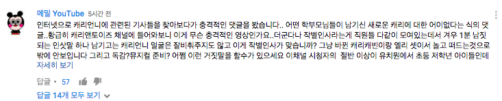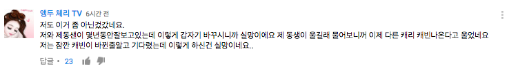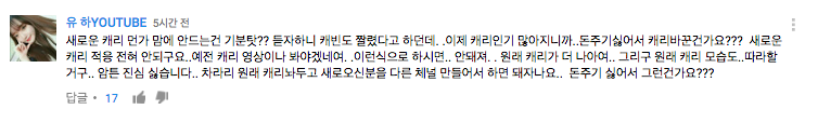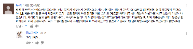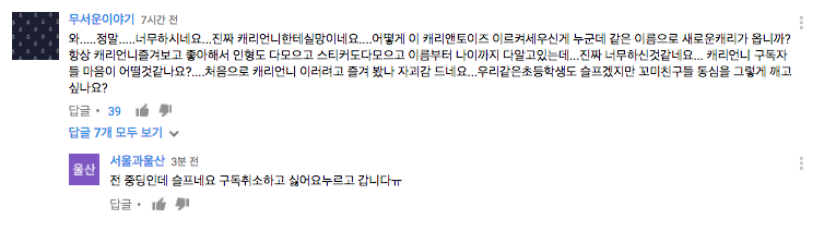 캐리 앤 토이즈 역시 후폭풍을 분명히 예상했을 것이며, 이에 대비해 채널 개편이라는 말로 설득을 위한 20여분짜리 콘텐츠를 제작하였다. 그럼에도 불구하고 현재 콘텐츠의 Unlike는 8,000개를 넘어서고 있다. (Like는 5000여 개) 댓글은 더욱 심각하다. 구독을 중단하겠다고 선언한 팬도 있을뿐더러, 구석으로 밀려난 1대 캐리 언니를 응원하며 회사의 태도에 대해 아쉬움을 나타내는 글이 줄을 이었다.
