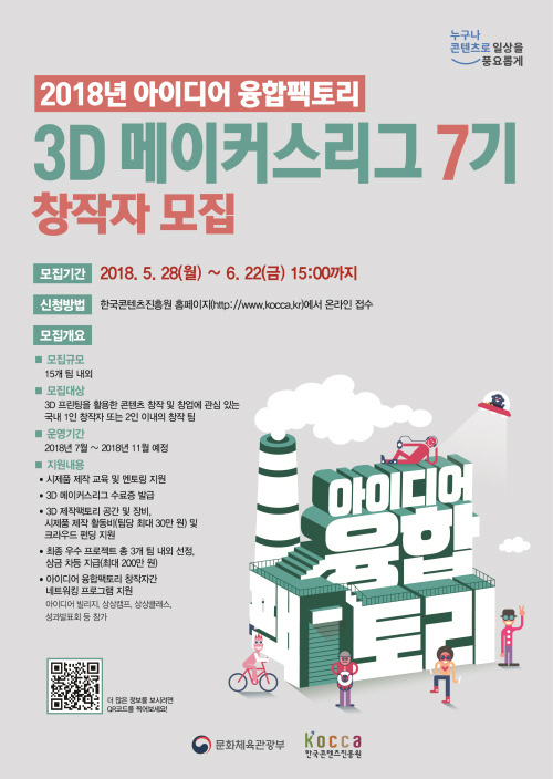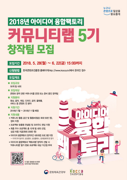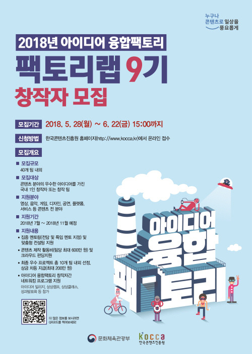 한국콘텐츠진흥원, 줄여서 콘진원은 콘텐츠 창작자를 위해 매번 다양하고 폭넓은 지원사업을 하는 편이다. 콘진원 지원사업은 직접제작비를 주기보다, 교육과 공간/시설을 지원하고 성과에 따라 포상을 차등 지급하는 편이 많다. 그럼에도 한국콘텐츠진흥원은 다양한 사업을 전개하기 때문에 공모전부터 시작해 지원사업 등이 활발하기 때문에 눈여겨볼 필요가 있다. 또한 콘진원 사업의 경우 콘텐츠 외에도 비즈니스화, 제작자, 영상 외 작가와 같은 스토리텔링, IP 사업 화등 다양한 사업에 지원하는 편이다. 대표적인 지원 프로그램으로는 아이디어 융합 팩토리가 있고 2018년도에는 5월에 공고가 났다.