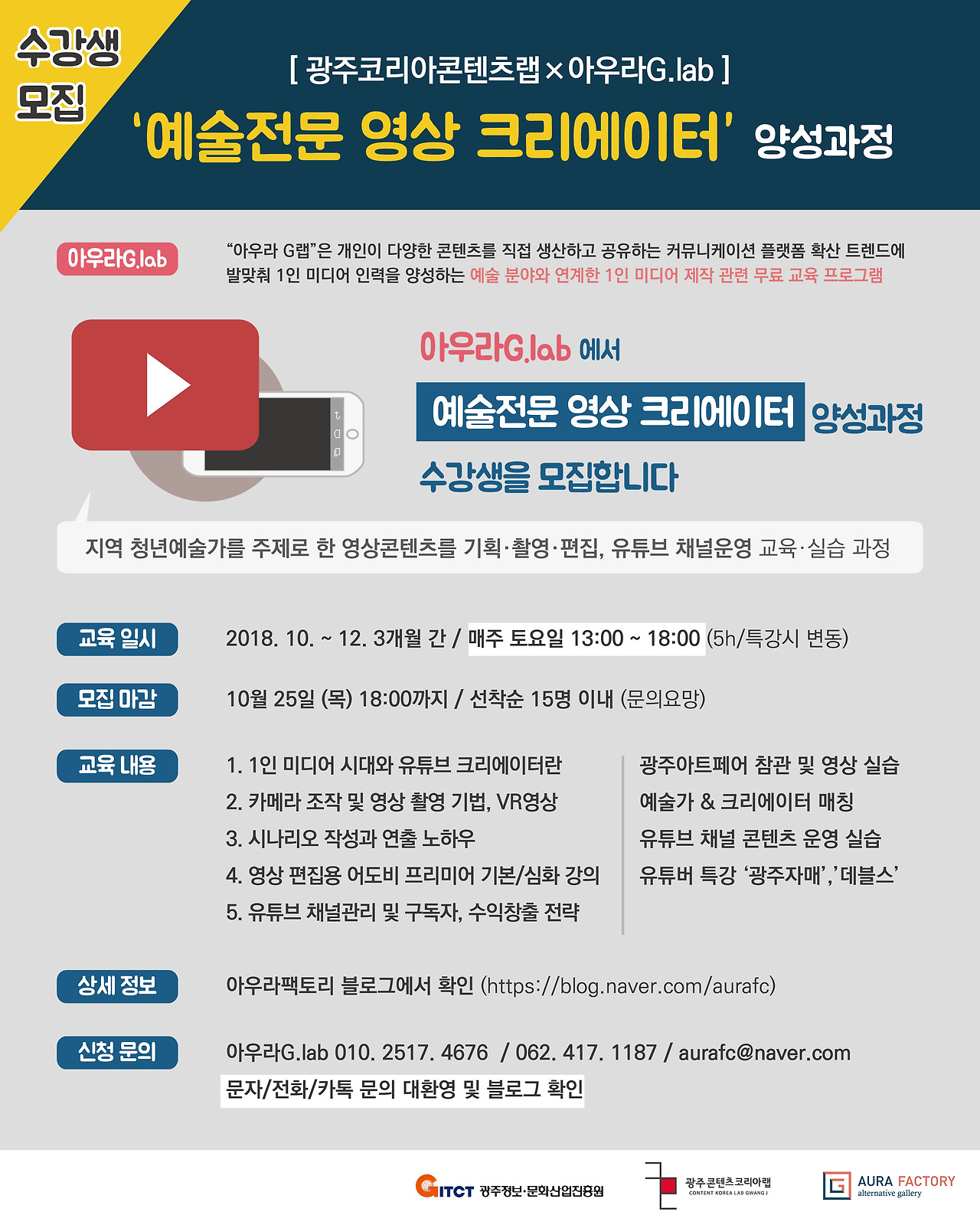비엔날레, 아시아 문화전당 등 문화의 고장인 만큼 크리에이터 지원 프로그램도 가장 먼저, 일찍 시작했을 뿐 아니라 1인미디어 크리에이터에 대한 슈퍼스타 탄생을 만들기 위해 부단히 노력했다. 개인적으로 2016년 부터 광주 정보문화산업진흥원과 연을 맺어 1인미디어 크리에이터 육성과정을 시작으로 심사위원 활동 및 참여 프로그램에 적극적으로 활동했는데, 여전히 크리에이터 육성사업에 적극적이다. 또한 콘텐츠 크리에이터의 창업 지원 프로그램에 참여를 독려하는 것과 함께 제작자들이 콘텐츠를 넘어 비즈니스로 연계하는데 후속 프로그램을 만드는 과정이 인상적이다. 1월 초부터 Grow up! MCN 연계 크리에이터 지원사업을 개최하고 있으며 총 지원 예산은 2억 가까이 된다. 선정된 크리에이터에게 300만 원씩 20팀에게 지원하고 이중 12팀에게 추가로 500만 원을 제공하는 현금 지원이 시작되었다.