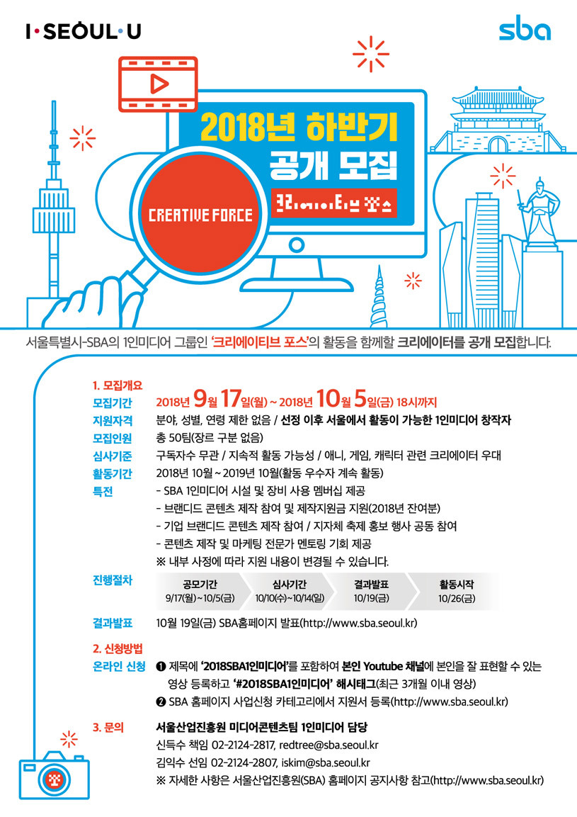 서울산업진흥원(SBA)의 크리에이터 프로그램은 지원 프로그램이기보다 실용적인 활동 프로그램에 초점을 맞추고 있다. 연간 2회씩 모집되는 크리에이터 포스라는 1인창작자 협업 모델을 비롯해, 크리에이터 공모전등이 개최되고 있다. 아직 규모면에서도 그렇고 지원내용에서도 전국단위의 콘진원과 같은 곳과는 차이가 있지만, 내실 있고 실용적인 측면에서 프로그램 등이 운영되고 있는 것이 특징이다. 기업매칭과 비즈니스 프로그램 등을 도입하기 위해 적극적으로 노력하는 것은 물론, 제작지원까지 기획되어 운영되고 있으며, 포스 멤버가 되면 월간 네트워킹 행사와 협력활동이 인상적이다.
