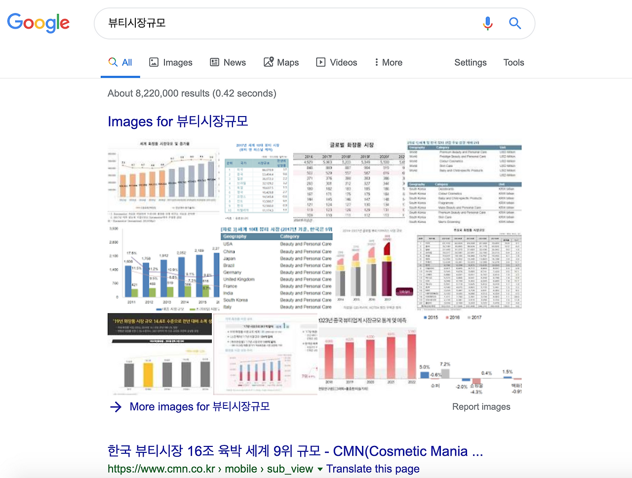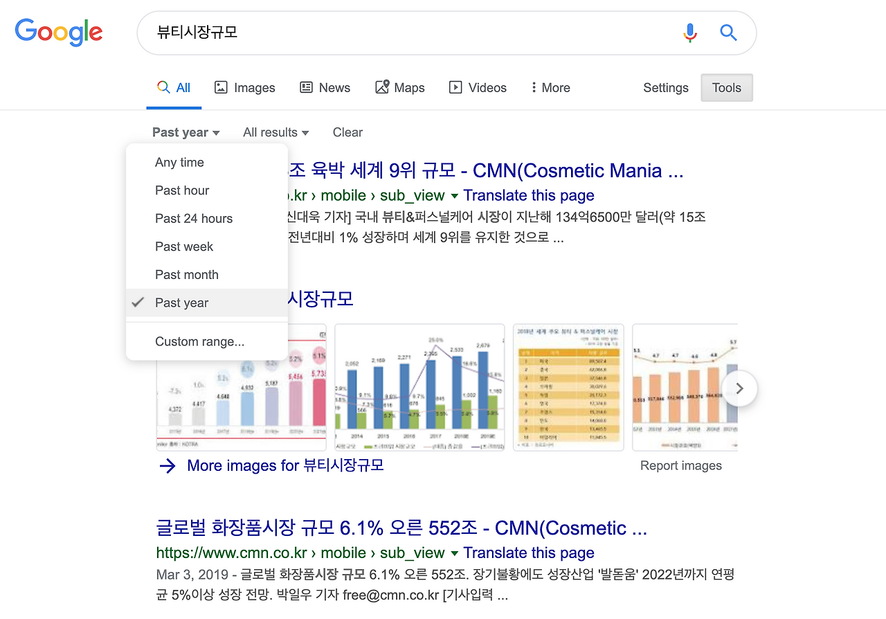 검색시 Tool 영역에서 Past Year을 누르면 최신정보로 살펴볼 수 있다. 시장을 분석하는 역량은 숫자 읽는 능력과 이를 이해하고 적용하는데 인사이트에 있다. 가장 좋은 방법은 우선 뉴스 기사를 먼저 찾아보는 것이다. 검색엔진을 통해 키워드+시장 만 검색해도 뉴스에서 다루는 다양한 자료와 정보들이 쏟아져 나온다.