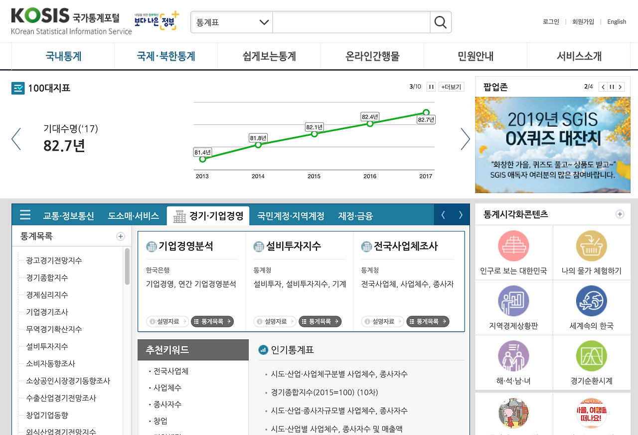심심할 때마다 살펴보면서 시장을 파악하는 것도 좋은 전략 다음 방법은 통계 사이트를 이용하는 것이다. 국가통계포털에서는 시장규모는 물론 주제별 내용별 통계가 잘 정리되어 있다. KOSIS의 통계는 정확성뿐만 아니라 공식적인 자료라는 점에서 매우 신뢰도가 높다. 단 기능별 분류에 초점이 맞춰져 있기 때문에 자료 확인 후 대조 및 이와 관련된 인사이트는 추가로 찾아보는 것을 권장한다.