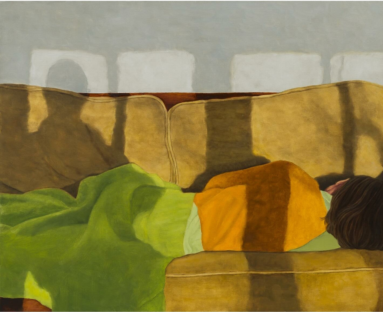 소파, 그림자, 사람을 주로 그리고 소파에 있는 사람들은 누워있거나 책을 읽는다. 그림 속 인물은 흰머리에 주름진 얼굴로 보아 50대 정도로 보인다. 작품 속 인물들 대부분이 40~50대 중년들이어서 그런지 중첩되는 인물이 많았다. <홈파티>의 연극배우 이연, <레몬케이크>의 기진, <안녕이라 그랬어>의 은미, <빗방울처럼>의 지수가 바로 떠올랐다.