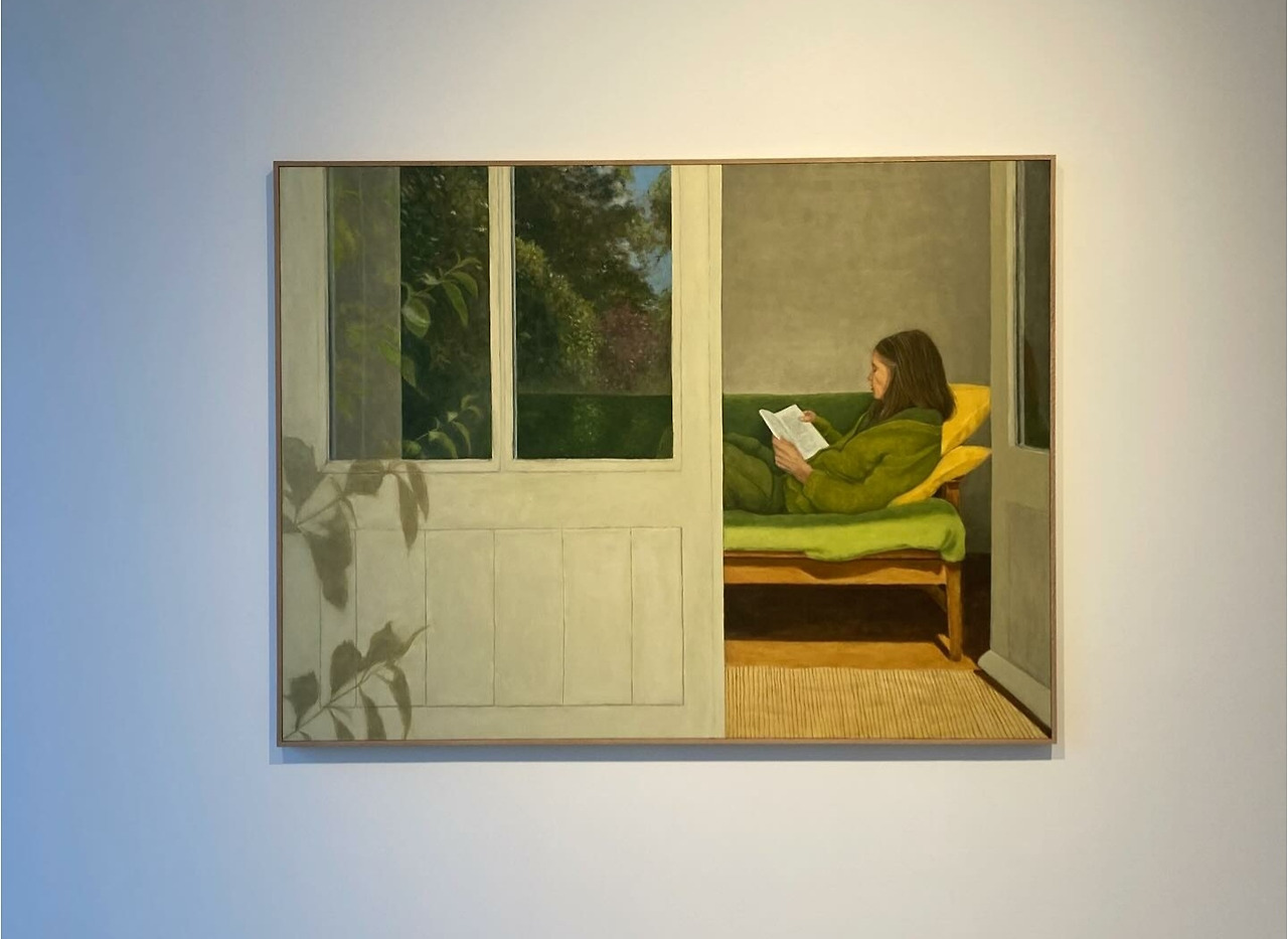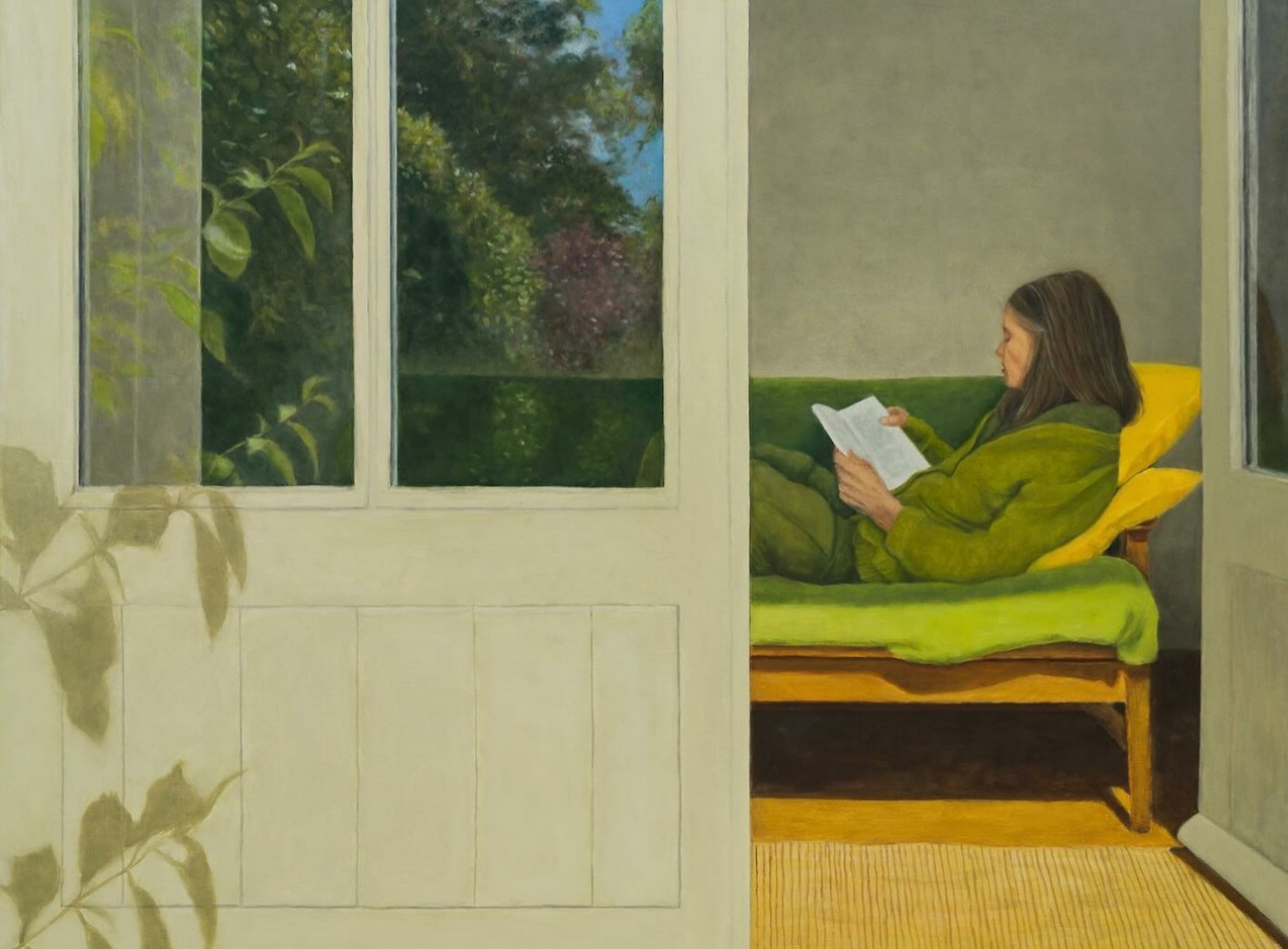 표지그림은 Jess Allen의 <Do we read to feel we are not alone?> 2024년작이다. 우리는 혼자가 아니라고 느끼기 위해 책을 읽는가? 독자의 입장에서 지은 제목 같기도. 성별을 알 수 없는 누군가 소파 위에 거의 누워 책을 읽고 있다. 원본을 찾아보니 중년 여성이다. 옆모습이 화가의 얼굴을 닮기도 했다.