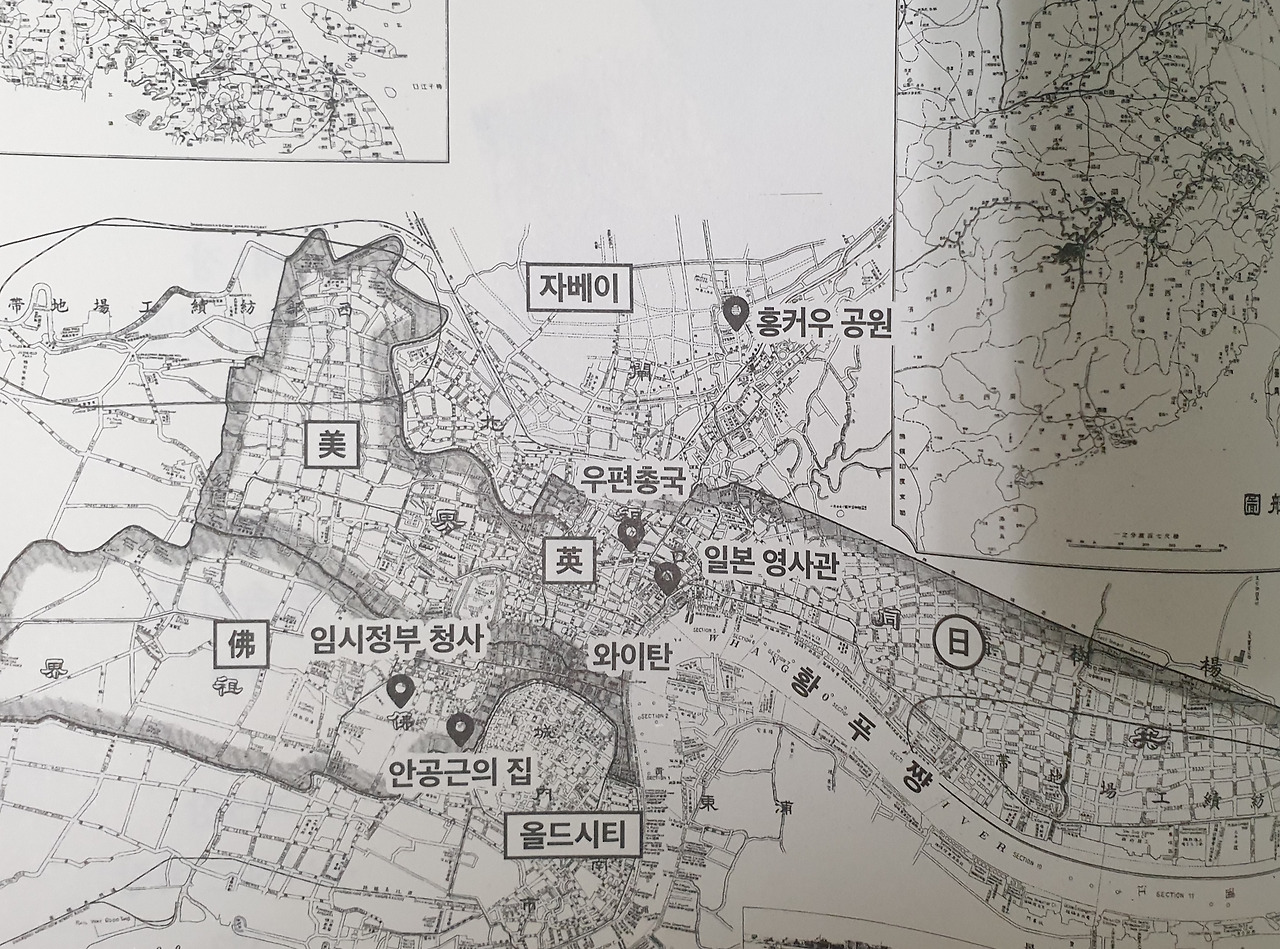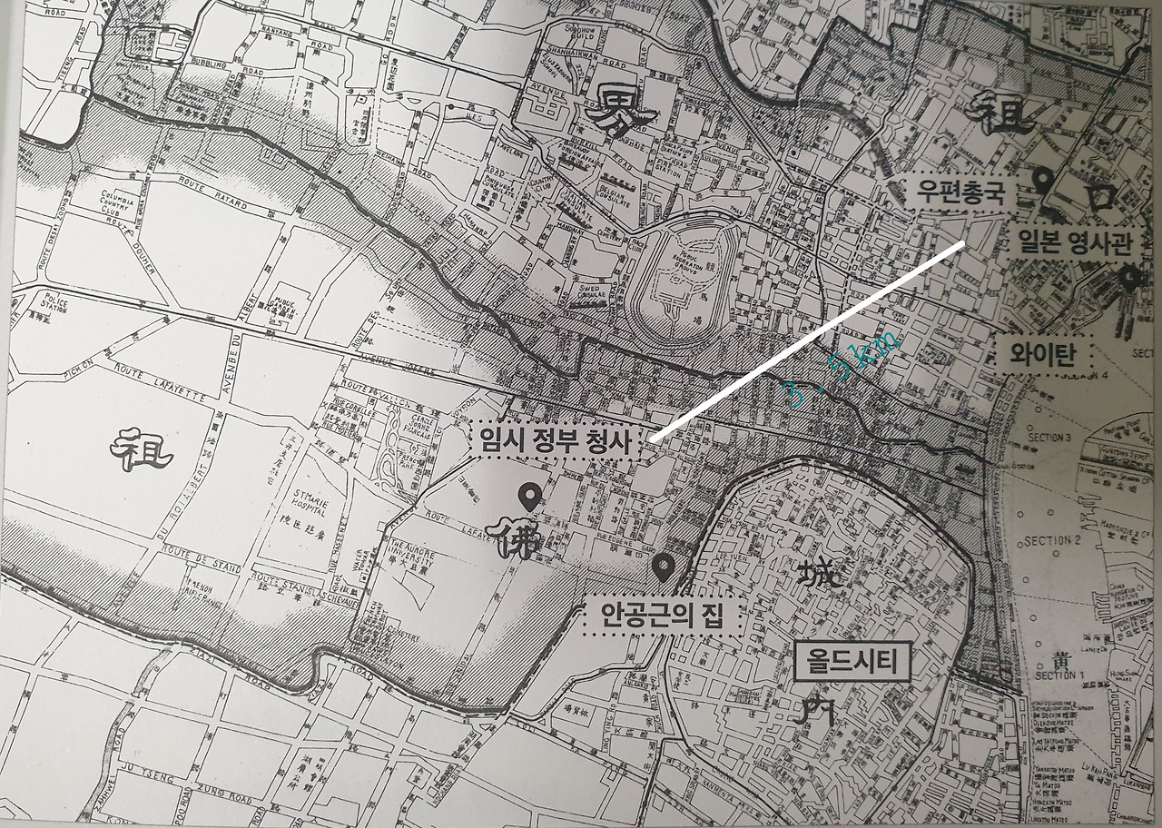 프랑스 조계지와 공공 조계지의 경계. 대한민국 임시정부청사는 일본 경찰과 군인이 함부로 영향력을 행사할 수 없는 프랑스 조계지에 자리를 잡았는데, 일본 영사관과의 직선거리는 고작 3.5km 정도밖에 되지 않았다.