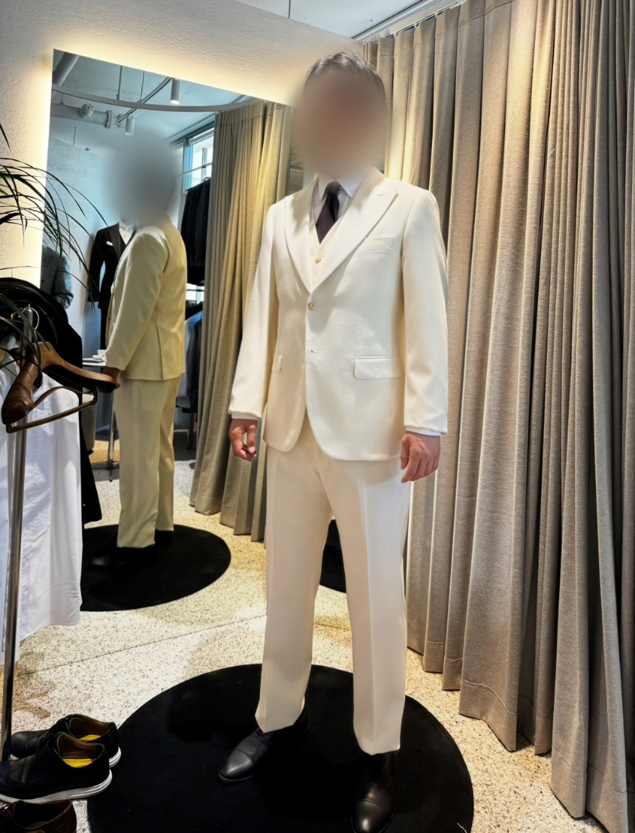 플래너가 없었기에 웨딩드레스숍 원장님께 도움을 요청했다. 원장님은 우리에게 남성 예복 테일러샵 대표님을 소개해주셨다. 우리는 소개받자마자 바로 그곳을 방문했다. 매장에 들어가 디스플레이가 된 정장을 둘러보니 소재도 좋고 디자인도 예뻐서 마음에 들었다. 그렇지만 생각보다 예복 대여비가 굉장히 높았다. 내가 고른 촬영용 드레스가 총 4벌이어서 거기에 어울리는 양복을 최소 2-3 착장만 대여해도 지출이 꽤 나가는 것이다.