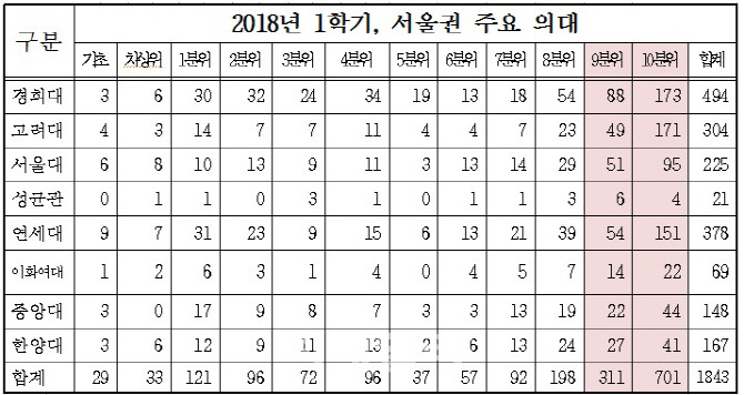 2018학년도 1학기 기준 서울권 주요 의대(치의학·한의학·의학) 학생 소득분위 현황 (단위: 명, 자료: 김해영 의원실)