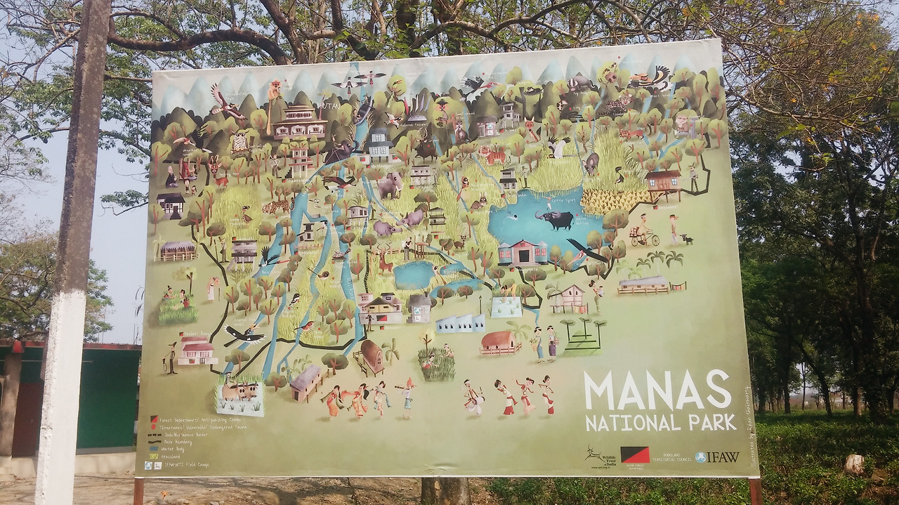 국립공원 어귀에서 가장 먼저 나를 맞은 건, 예상보다 ‘아기자기한’ 안내판이었다. “MANAS NATIONAL PARK”라는 커다란 글자 아래, 숲과 강과 마을이 그림처럼 펼쳐져 있었고, 호랑이와 코끼리, 새들이 장난스럽게 그려져 있었다. 지도 속에서는 모든 동물이 서로의 영역을 침범하지 않고 공존하는 것처럼 보였다. 그런데 그 지도 상단, 산이 겹겹이 이어지는 부분에는 자그마한 하얀 글씨로 ‘BHUTAN’이라는 글자가 박혀 있었다. 그 한 단어가 그림의 분위기를 바꿨다. 이 숲은 국립공원이면서 동시에 인도와 부탄의 국경이기도 했다. 호랑이를 보러 왔다고 생각했는데, 나를 먼저 맞이한 건 ‘국경’이라는 단어였다.