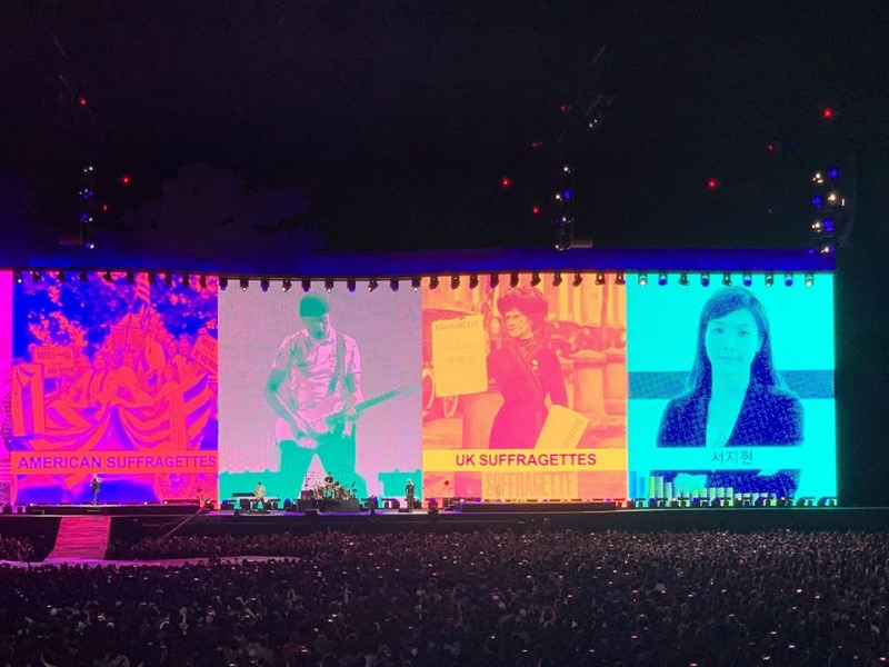 얼마 전 처음으로 내한 공연을 가진 록 밴드 U2. 이번 내한 공연에서, 그들은 여성에게 가해진 지난한 폭력의 역사, 그리고 이에 맞서 투쟁한 인물들을 무대의 비주얼 아트로 보여주며, "모두가 평등해지기 전까지는 아무도 평등하지 않다"는 강렬한 메시지를 남겼다.