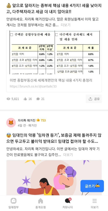 요즘 부동산 커뮤니티를 보면 세무사 분들보다도 세무 지식이 더 뛰어난 분들도 많으시거든요. 회원분들끼리 모여서 세금에 대한 스터디를 하시는 경우도 적지 않고요. 저의 경우에도 이런 커뮤니티를 통해서 부동산 세금에 대한 기초적인 지식과 세금 제도가 어떻게 달라지는지에 대해서 조금씩 배워나갈 수 있었던 것 같아요.