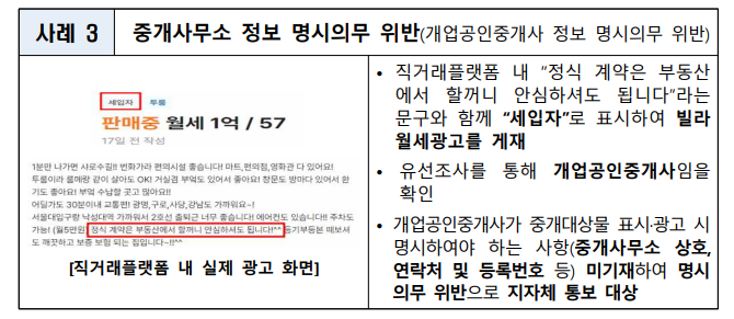 이와 함께 국토부에서는 온라인 직거래 플랫폼에서 직거래를 빙자한 부동산 부당 광고를 게시하는 행위 역시 계속해서 모니터링해 나갈 예정인데요. 다음과 같은 두 가지 위반 사례에 대해 조사하겠다는 게 국토부의 설명입니다.