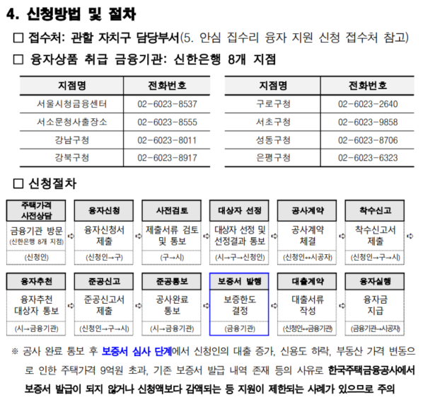 신청 전에 먼저 해당 융자상품을 취급하는 신한은행 8개 지점을 방문해 주택가격 등에 대해서 확인받은 뒤 구청 담당부서에 융자신청서를 제출하는 방식인데요. 구청이 전달한 서류를 서울시가 심사해 대상자를 선정하면 신청인은 시공업체와 공사계약을 체결하고 공사를 진행해야 합니다.