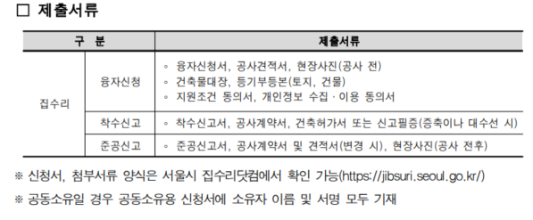 신청서와, 첨부서류 양식은 서울시 집수리닷컴에서 확인할 수 있습니다.